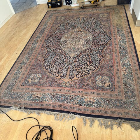 Tæppet har et detaljeret, orientalsk-inspireret mønster i lyse og mørke nuancer. Tæppet er købt 1960'erne, velholdt og uden slidspor