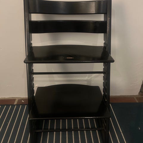 Stokke Tripp Trapp højstol i sort træ. Klassisk justerbar højstol med fodplade og siddeplade, der kan tilpasses barnets højde. Egnet til brug ved spisebordet og kan anvendes gennem flere alderstrin. Fremstillet i massivt træ med robust konstruktion.