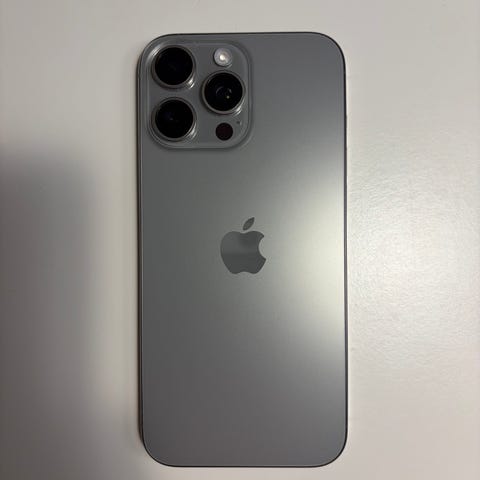 Apple iPhone 16 Pro Max smartphone med 256 GB intern hukommelse. Modellen har stor skærm og tredobbelt kamera på bagsiden. Enheden understøtter MagSafe-tilbehør, hvilket ses af ringen på bagsiden af coveret. Velegnet til brugere med behov for god lagerplads til apps, billeder og video.