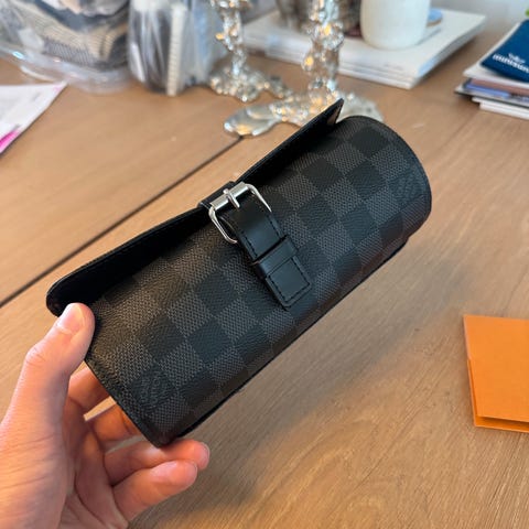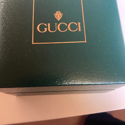 Smykkeskrin til ure med flere puder til opbevaring. Skrinet har hængslet låg og polstret inderside med separate rum til ure. Ydersiden har mønstret overflade og metalbeslag ved hjørner og lås. Egnet til opbevaring og organisering af ure i hjemmet eller i forbindelse med rejse og transport.