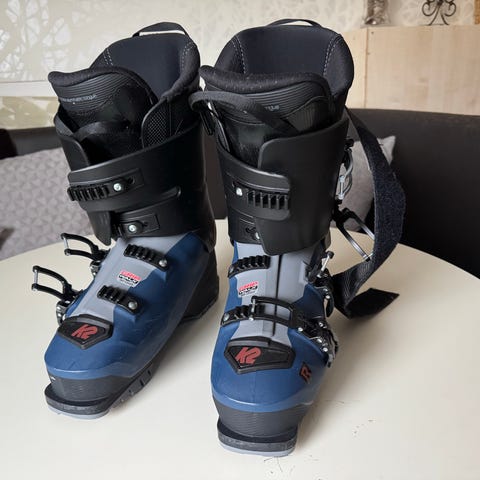K2 skistøvler i størrelse 28.5 (indre længde ca. 28,5 cm, sålelængde 326 mm). Farve sort med blå indersko og metalspænder. Støvlerne har flere justerbare spænder for tilpasning omkring foden og skinnebenet. Egnede til alpinski med standard skibindinger.