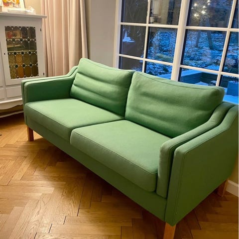 Flot Grete Jalk sofa betrukket med nyt stof, længde 200cm, dybde 85cm. Pris kr. 6000.