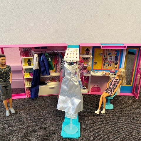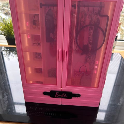 Barbie garderobeskab legetøj i lyserød plast. Skabet kan åbnes og lukkes og har flere rum, hylder og skuffer til opbevaring af Barbie-tilbehør. Indvendigt er der bøjlestang og bøjler til dukketøj samt små hylder til sko og andre småting. Ydersiden har døre med vinduer og trykt Barbie-logo. Egnet som tilbehør til Barbie-dukker og andre dukker i tilsvarende størrelse.