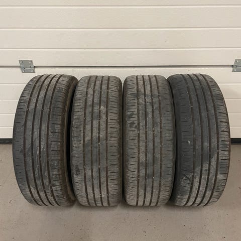 Jeg vil sælge Continental-dæk i god stand. Jeg har et sæt fra 2022 og et sæt fra 2018, begge med 5 millimeter mønsterdybde. Der er to sæt fra 2022 og to sæt fra 2018.