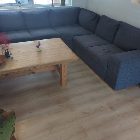 Til den faste side, hvis du ikke vil sidde for lavt. 45 cm sædehøjde. Modulerne kan flyttes rundt, hvis man vil.