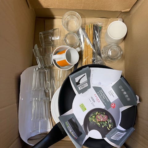 Blandet lot med 6 skåle, to tallerkener, 5 kopper, 4 potter, et fad med brugsspor, en pose med ulige antal grillbestik og ikea bestik