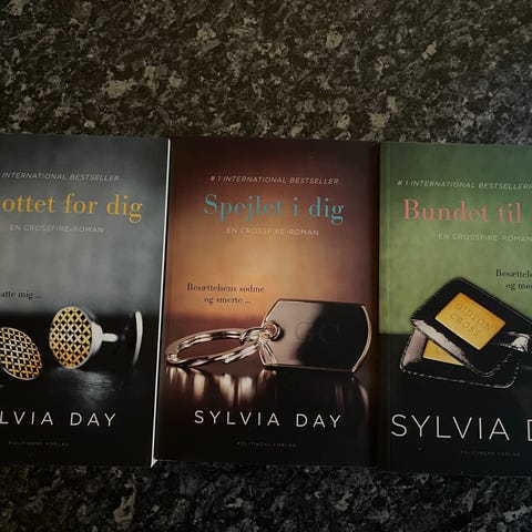 Sylvia Day Crossfire-serien bogsæt med 4 bøger på dansk. Sættet indeholder paperback-udgaver af titlerne i serien, som ses på billederne. Bøgerne er skønlitteratur og egner sig til læsere af romantik og erotik. Alle bøger er på dansk og i samme serie, hvilket gør dem velegnede som samlet læsepakke eller supplement til en eksisterende samling af Sylvia Day-romaner.