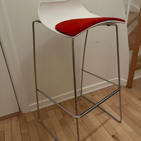 Klapstol i barstolshøjde med sæde og ryglæn i lyst træ og stel i grålakeret metal. Stolen kan foldes sammen for nem opbevaring og har fodstøtte foran.