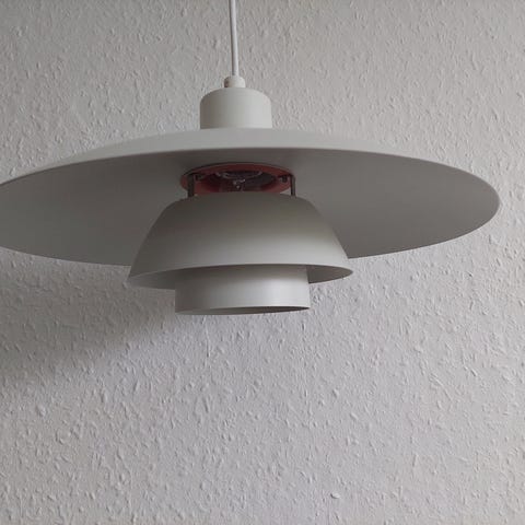 Louis Poulsen PH loftlampe designet af Poul Henningsen. Lampen er udført i metal med flere skærme, der giver en blændfri og nedadrettet belysning. Ydersiden fremstår i en lys, hvidlig nuance, mens de inderste skærme har farvede detaljer. Egnet som loftlampe over f.eks. spisebord eller i opholdsrum. Anvender standard fatning til pære (se evt. nærmere specifikation på lampen).