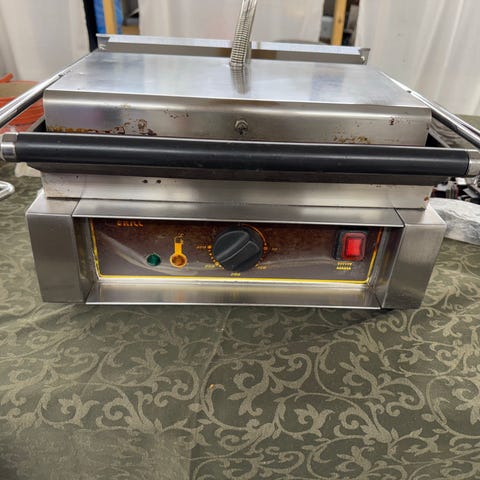 Maxima MCG-Panini-2359 paninigrill med riflet top- og bundplade. Grillen er fremstillet i rustfrit stål og har en effekt på 2200 W ved 230 V / 50 Hz. Nettovægt ca. 17 kg. Velegnet til tilberedning og opvarmning af fx panini, sandwiches og andre grillede emner på de riflede grillplader. Justerbar termostat på fronten samt indikatorlys for drift. IPX3-klassificeret.