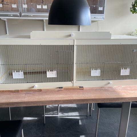 Kassebure/ynglebure med flere separate bure i et samlet system. Konstruktionen består af seks rum fordelt i to rækker, hver med frontgitter. Der er indbygget god belysning i hvert rum samt siddepinde og mulighed for montering af foder- og vandbeholdere. Burene er egnet til mindre fuglearter såsom finker og kanariefugle. Den står hævet på ben for lettere rengøring under enhed. Mål længde 82 cm hvert bur, dybde 40 cm og højde 54,5 cm. Burene er af nyere dato og velholdt. Skal ses!