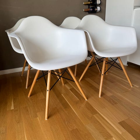 6 x hvide spisebord stole, alle i rigtig pæn stand, der har altid været brugt hynder. Stolen er i træ, og sæde i plast. Fra ikke ryger hjem.