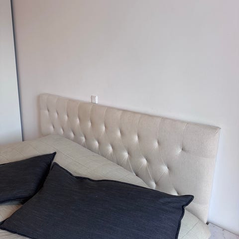 IKEA sengegavl i lys, neutral farve. Polstret overflade med syning i midten, som giver et enkelt og roligt udtryk. Velegnet som gavl til seng i soveværelse eller gæsteværelse.