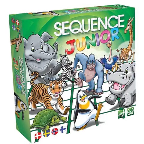 Børneudgave af det klassiske Sequence-spil. Slidt æske, men indhold er fint.