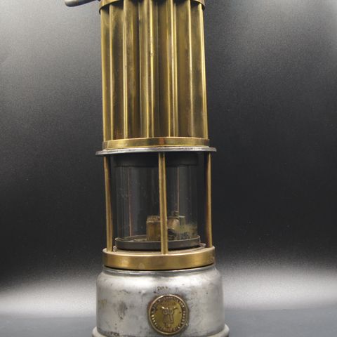 Giv et bud.Thomas & Williams Cambrian minearbejdslampe i messing. Lampen har cylindrisk glasindsats og metalbeskyttelse omkring lyset. Den er udstyret med bærehåndtag og ventilationsåbninger i toppen. Egnet som samlerobjekt eller dekorativ belysning i hjemmet eller værkstedet.