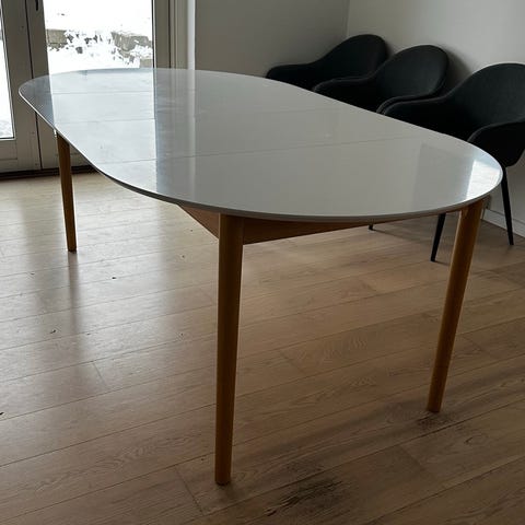 Marstrand rundt spisebord med udtræk. Ø110 cm og med de to medfølgende tillægsplader kan det blive 200 cm. På tillægspladerne er der også bordramme/sarg så det ser flottere, mere helstøbt ud.