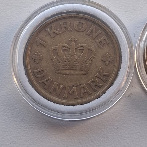 Danmark 1 krone mønt fra 1940. Forsiden viser kongekrone og monogram med årstal 1940, bagsiden har påskriften "1 krone Danmark" med kronemotiv. Mønten er rund og fremstår i metal med gyldenlig farvetone. Egnet til samling af danske mønter eller som historisk objekt fra perioden omkring 2. verdenskrig.