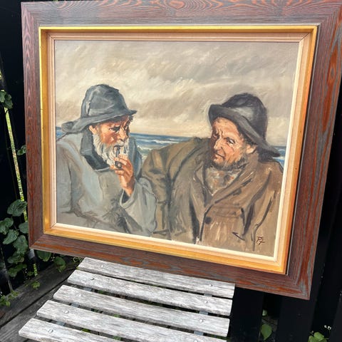 Billede af fisker med pibe i fin ramme. Kunstneren er Harder. Der er lille ridse, se billede. Måler 50 x 60.
