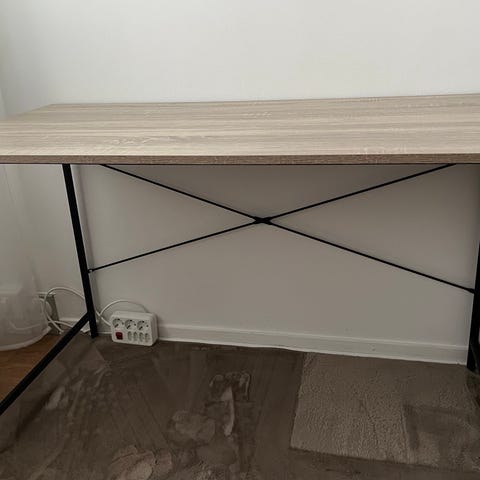 Moderne skrivebord i træ-finish med sorte metal-ben.
