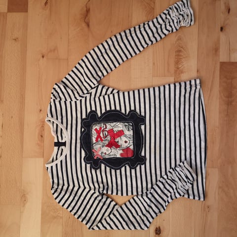 Sød bluse til pige i str. 110. Blusen er hvid og fremstillet af bomuld. Den har høj hals og lange ærmer. Foran er der sommerfuglemotiv med påsyede detaljer og små dekorative sten. Velegnet som hverdagstrøje eller til pænere brug for et barn i størrelse 110.