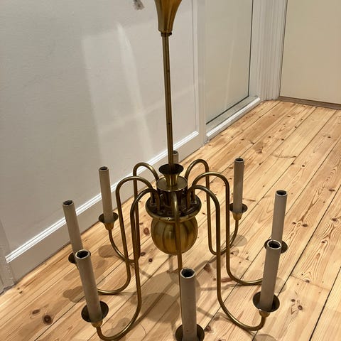 Fin gammel lysekrone i messing. Pæn stand har dog lille skade på den ene fatning. Ses ikke når den hænger