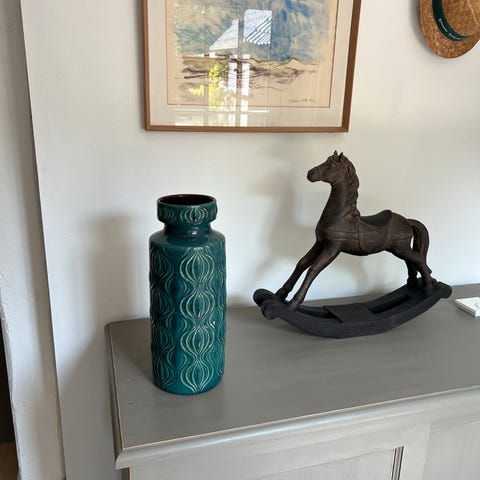 En meget smuk vase med blå farver med guldfarver i organisk stil. Håndlavet på Bornholm. 20 cm høj. Med mærkat og med underskrift skrevet ind på vasen. Kr 150