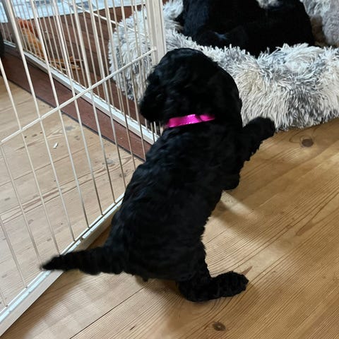 Vi har en tæve tilbage af et kuld på 3 stk. Det er stueopdræt sammen med familie med børn.