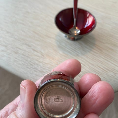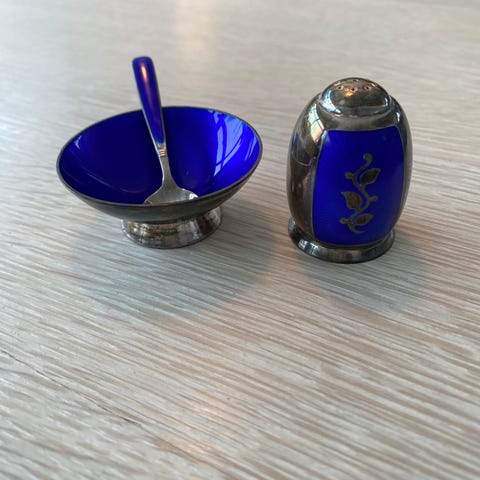 Salt- og pebersæt bestående af en lille skål med tilhørende ske samt en peber- eller saltbøsse. Stemplet VB Sterling Denmark.