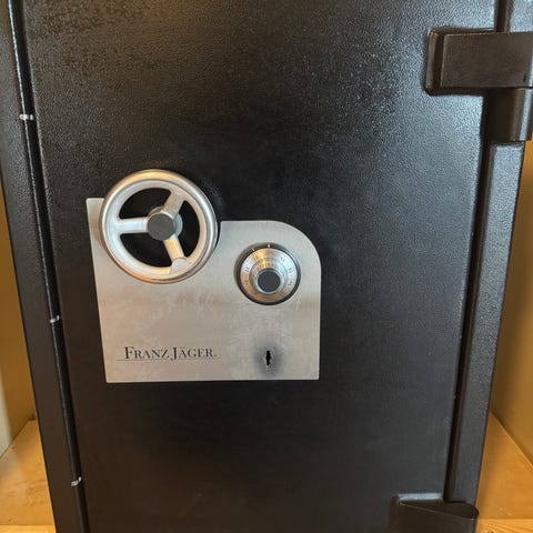 Kaso pengeskab i brun stål med front i sort. Skabet har sidehængslet dør med greb og nøglelås. Indvendigt er der hylder og et mindre aflåseligt rum i toppen til opbevaring af kontanter, dokumenter eller andre værdigenstande. Velegnet til kontor eller privat brug, hvor der er behov for sikker opbevaring.