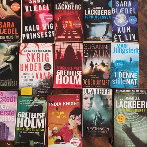 Blandet parti bøger i både paperback og hardback. Forskellige forfattere og genrer, herunder romaner, biografier og andre typer litteratur på dansk og engelsk. Egnet til læsning for voksne læsere, der ønsker en varieret bogsamling.