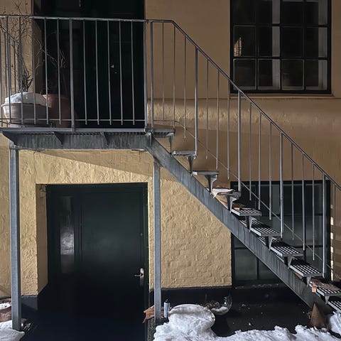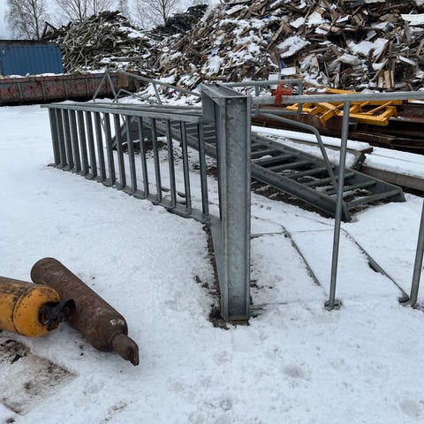 Galvaniseret udendørs trappe i stål med perforerede trin, repos og gelænder i begge sider. Trappen er udført i kraftig stålkonstruktion med skridsikre trin og reposplader, egnet til montering ved f.eks. bygninger, containere eller terræn med niveauforskel. Overfladen er varmgalvaniseret for øget modstandsdygtighed over for vejr og slid. Velegnet til udendørs adgangsvej, nødudgang eller lignende formål, hvor der ønskes en robust metaltrappe med rækværk.