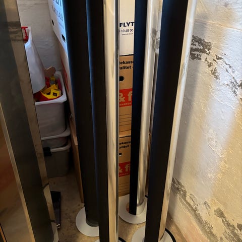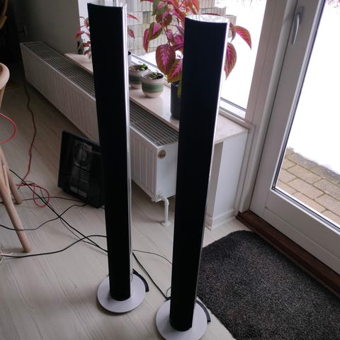 Bang & Olufsen gulvhøjttalere i sort. Søjleformede højttalere på rund fod, tilslutning til 230V, 50 Hz og angivet effekt på 140 W. Velegnet som front- eller surroundhøjttalere i et hjemmebiograf- eller stereoanlæg. Designet til placering på gulv og passer ind i mange typer indretning med deres slanke, sorte udseende.