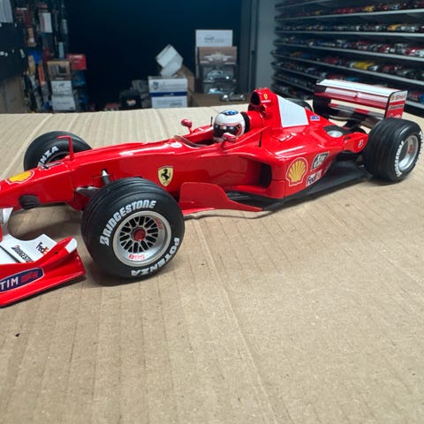 Ferrari. Racer. Six Time Wold Champion 1994-1995-2000-2001-2002-2003. Forsølvet på rød soft plade (lille afslag højre foran). Hot Wheels. Med stående racerkører. Materiale: Metal, plast. Scale: 1:18.