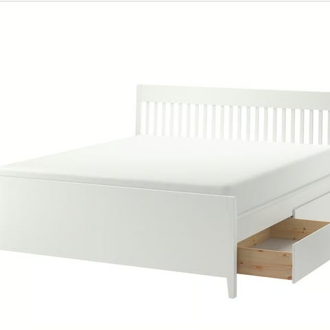 IKEA IDANÄS sengestel med opbevaring (4 skuffer) inkl. standard lamelbunde. Sengen har en lille revne efter en overskruning på den ene skuffe (se billede), men fejler ellers intet - sælges på grund af flytning.