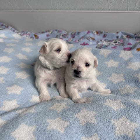 Mor er Ella (Malteser) og far er Alfred (Bichon Havanais/Malteser). Begge forældre er rolige, sociale og en kæmpe stor del af vores hverdag.