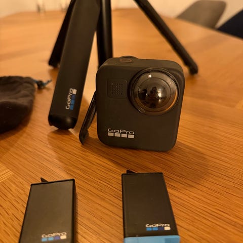 Go pro's 360-kamera. Brugt få gange. Diverse vinklede mounts samt chest-mount og sticky-mounts medfølger. Stofpose til kamera, og taske til alt tilbehør medfølger også. Hentes på Nørrebro