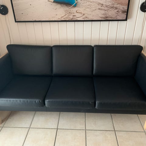Flot 3 pers. tremmesofa i sort læder og hvidolieret træ af bøg. Vedligeholdt og ingen huller eller mærker. Står super fin.