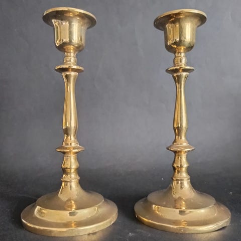 To store smukke gamle messing lysestager, puds dem eller behold den flotte patina. Bruges til fyrfadslys, der er også hul under til alm høje stearinlys.