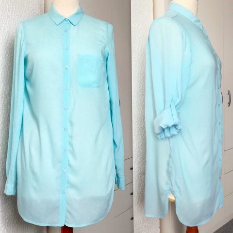Smuk skjortebluse med knaplukning. Manchet med to knapper. Ærmer kan rulles og fastgøres med knapper. Klassisk model i vævet kvalitet. Blanding af bomuld og Viscose. Et musthave i enhver garderobe.