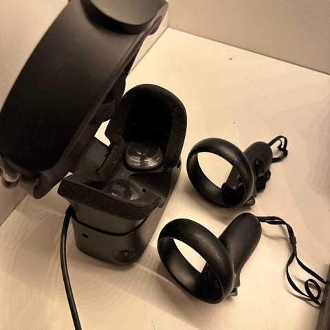 Oculus Rift S VR-headset i sort med tilhørende håndcontrollere. Headsettet har indbygget polstring omkring øjne og hoved for bedre komfort. Velegnet til brug sammen med kompatibel PC til virtual reality-spil og -oplevelser. Leveres med kabler og controllers som vist på billederne.