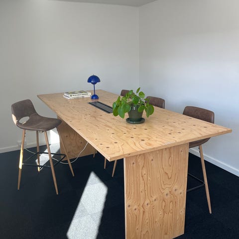 Bordet har en slank, rektangulær facon og er lavet i en grålakeret metalbordplade med affasede kanter. Benene er består af to solide metalsøjler.,Afhentes i:,Røde Kors Hjallerup (807),Bemærk at mail, chat og beskeder ikke besvares, og varen skal købes på knappen "Gå til varen"