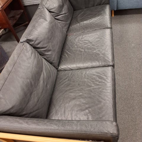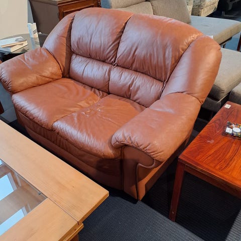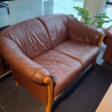 Sidste chance. Sofaen har bløde, polstrede sæder og armstøtter. Den er lavet af læder og har en varm brun farve.,Afhentes i:,Røde Kors Virum (173),Bemærk at mail, chat og beskeder ikke besvares, og varen skal købes på knappen "Gå til varen"