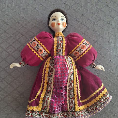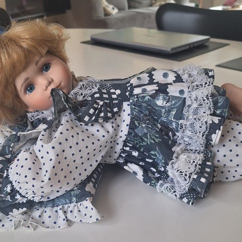 Nok en tysk dukke med porcelænshoved og med en mulighed for at være oprejst via en stang. Den måler 30 cm, vejer 300g og fremstår som en dukke, der har stået til pynt