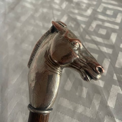 Stokken er udstyret med en sølvbelagt krave, der giver både pynt og forstærkning mellem håndtaget og skaftet, samt en metalfitting ved basen for holdbarhed. Træet viser en attraktiv naturlig åretegning og en varm patina, som er udviklet over årtier med brug.