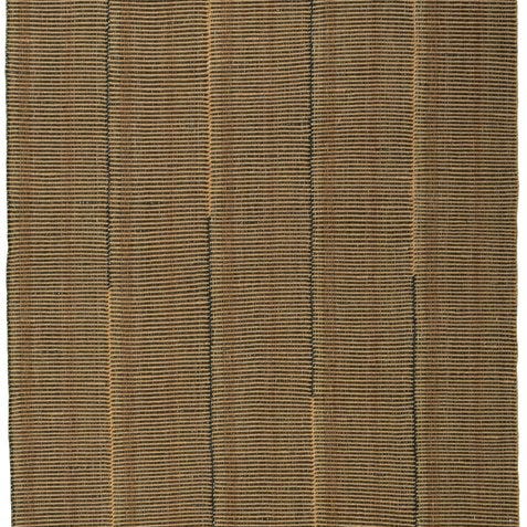 Dette håndvævede designer-kelim fra Pakistan imponerer med sin klare, minimalistiske stil og en varm, naturlig farvevirkning. Det fine, stribede mønster i sorte og okker nuancer giver kilim'en en rolig, elegant fremtræden og gør det til et tidløst designelement i moderne boligindretning.