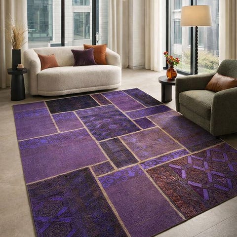 Uldtæppe bestående af håndknudede og genbrugte tæppestykker. Det bevarer de originale mønstre under sit nye udseende og farvetone.