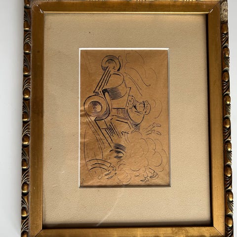 Hinterglas af en husindgang med trappe, søjler og slyngplanter omkring døren. I venstre side ses et vindue med lys i, og til højre et større vinduesparti. Billedet er indrammet i en klassisk ramme. På bagsiden ses en håndskrevet signatur.
