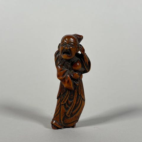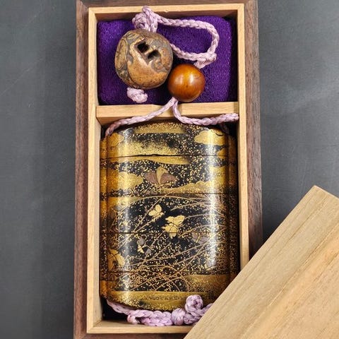 Inro med fem rum i fundame-lak, dekoreret med hira maki-e og kirigane af en blomsterførende Hanaguruma-vogn, Edo-tiden, 19. århundrede, indvendig Nashiji-lak med forgyldt guld; mål 10 x 5 x 3,2 cm; i fremragende stand. Klik på den blå "gå til varen" knap, for at købe eller byde på denne vare. Den samlede pris vil blive vist inden du afgiver dit bud.
