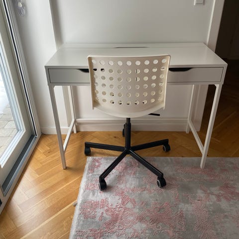 Den røde kontorstol og siddebolden, i str. 75, med pumpe, kan tilkøbes. Se mine andre annoncer for mere info.