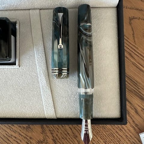 Maita Talete fyldepen, begrænset udgave på 199 enheder, fremstillet i Italien af blå italiensk harpiks og sølv, længde 129,50 mm, længde med låg 173,50 mm, diameter 14,50 mm, fyldning med converter eller patron, nib stål Medium (M) med mulighed for Fine eller Broad, 3 års garanti. Klik på den blå "gå til varen" knap, for at købe eller byde på denne vare. Den samlede pris vil blive vist inden du afgiver dit bud.